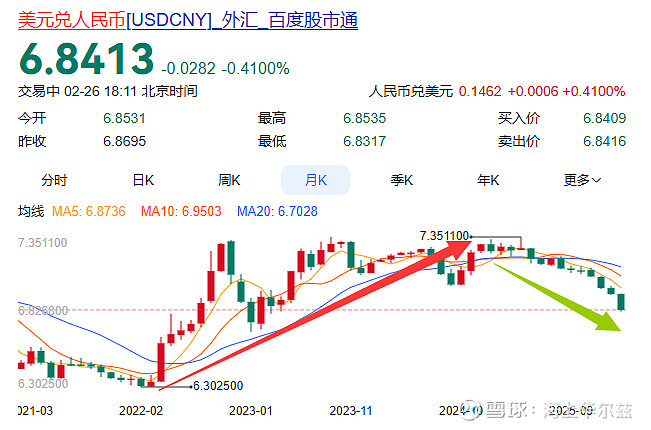 人民币持续升值,周期性调节,疫情后人民币从6.3贬值到7.3,现在又回到了6.58。当人民币升值的时候,从7到6,是很恐怖的。7的时候你拿100美金,兑换700元人民币;升值到6时,你100美金只能兑换600元人民币了,妥妥大怨种啊。