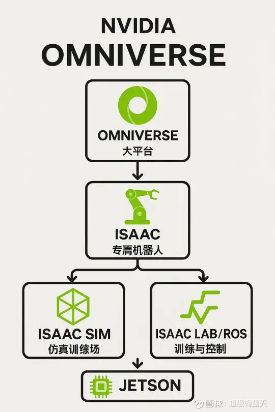 英伟达在物理 A的布局是是 Omniverse 平台,它聚焦在构建一个融合物理规律的数字孪生世界;具身智能对应的是 Isaac 平台(包括 Isaac Sim + Isaac ROS +Jetson),目的是让机器人“有身体、有感知、有决策力”的完整训练与部署系统。