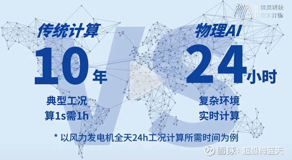 如果你用传统方法:每一秒钟都要用物理公式算出风、叶片、塔筒之间的力学关系,模拟它们会发生什么——那每一秒要算一小时,全场可能要算10年。这时候就需要物理 AI:我们先让 AI 在仿真世界里试错:给它模拟一个风电场,让它看各种风怎么吹、塔怎么晃;一次次训练后,它学会了经验——比如:“风从这边吹,就该把叶片往哪儿转才最稳又高效”。