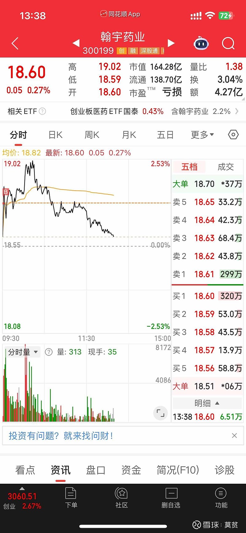 前几天看到一个大V在吹礼来,然后一看礼来连续上涨,昨晚还加速了,果断问豆包对标A股的礼来是谁,说是翰宇药业,跌了这么久在开始反弹了,于是我用力干进去,于是被套了,哎……模式外是亏损之源$礼来(LLY)$ $翰宇药业(SZ300199)$