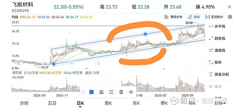 $飞凯材料(SZ300398)$ 飞凯材料接下来走势,参照红色圈这一波【前面半截已走的很像了,属高位横盘振荡】,现在22.28,然后走一个反弹上27,再下来21左右,再走一个横盘上23再下22,然后再上30;这大概会走3-5个月。慢慢玩的一支股。飞凯走不快的,股性不好,因为大盘走慢牛所以一直保持在上升通道中,都很不错了。