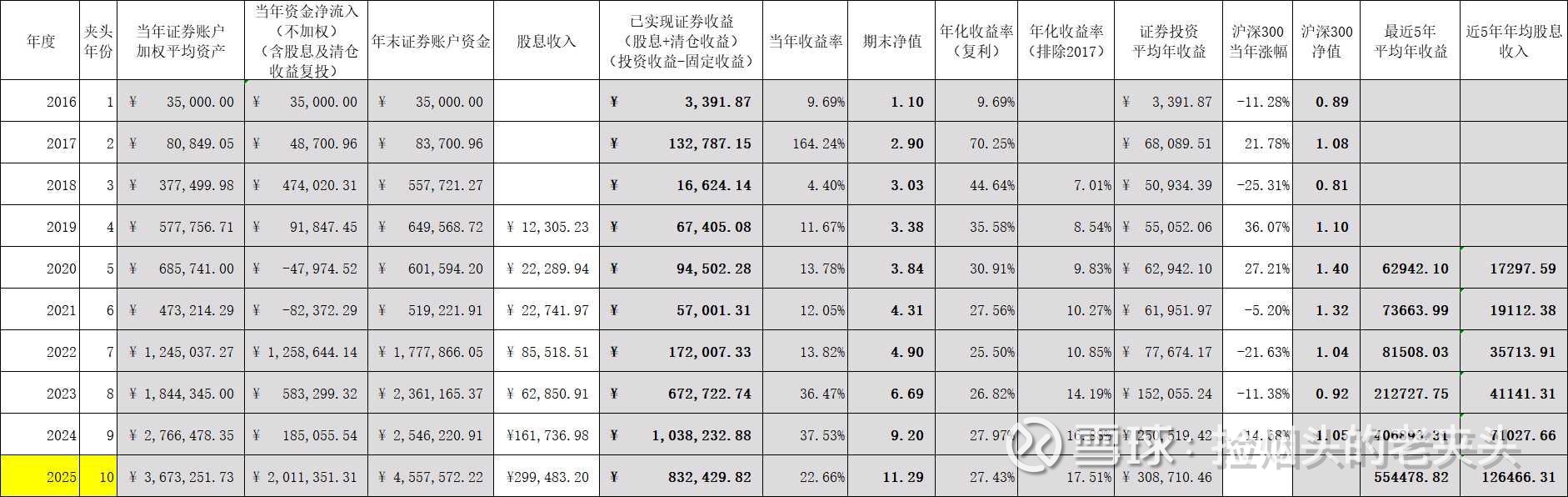 由于我采用的是清仓收益+股息确认投资收益,所以2016年至今的十年里全部取得了正收益,比如2018年虽然交易软件显示亏损,但全年仅卖出中国铁建一只票实现清仓收益,其他的票都是在买买买。十年夹头明显改善了我的经济状况。往后十年,我的投资或许只能依靠内生性增长了。毕竟目前的工资水平已经远远落后于投资收益。我希望在近1-3年内,投资可以反哺我的生活支出。毕竟在过去十年里虽然取得了很不错的投资收益率,但投资一直在吸我生活的资金流。