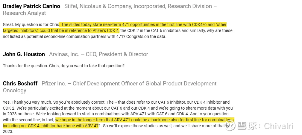 我认为下面这两段引述(网页链接{来自 2022 年 11 月的这次 ARVN 电话会议})最清晰地展示了辉瑞如何看待 Vepdeg 在联合用药中的地位(但我还有很多其他例子将在本文末尾分享);注意他们如何“希望” ARV-471 将成为他们一线联合疗法的“骨干(backbone)”,并关注它如何能与他们的其他疗法联合使用……