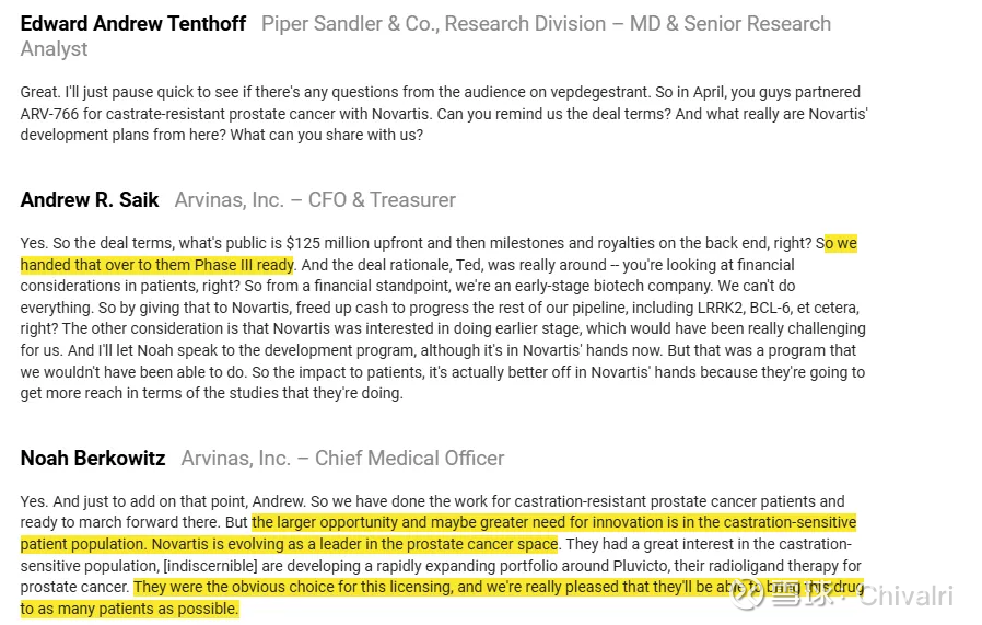 因此,在分析前列腺癌药物方面,诺华显然是一个非常了解情况的参与方,一旦该药物获批,他们很可能会在将其货币化方面取得巨大成功。现在,一个了解情况的参与方开出支票绝不保证批准……但诺华的支票是对该平台/机会/该药物并非完全是天方夜谭的一个很好的验证。网页链接{ARVN 显然也有同感}(注意 CFO 在这里口误了;预付款是 1.5 亿美元,不是 1.25 亿美元!):