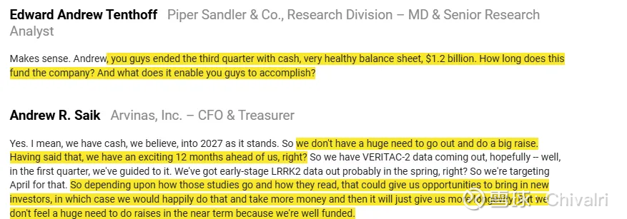 老实说:我不确定。ARVN 拥有巨额现金余额(>10 亿美元),但考虑到他们每年约 3.5 亿美元的研发支出(而且这还是在辉瑞承担一半 Vepdeg 费用的情况下!),他们也在疯狂烧钱。