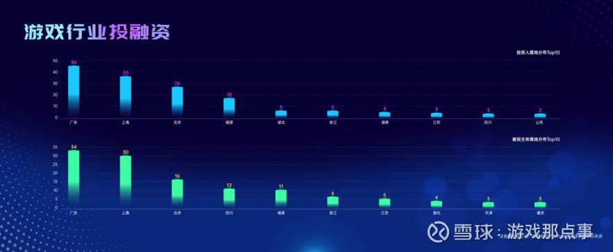 9.从投资层面我们来看,今年全国游戏行业公开的融资事件为162起,主要集中在广东、上海和北京,其中广东发起的有46起,占全国的28.39%。广东被投的企业是43家,广东企业的投资策略偏向多元化,既有收购也有孵化。