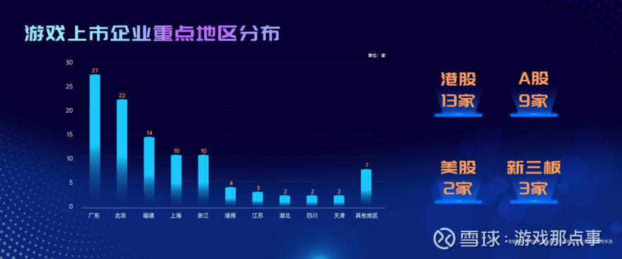 2025年广东有27家上市(含新三板)游戏企业,数量在全国各省市中位居榜首,其次是北京有22家,福建排名第三有14家,上海和浙江分别有10家。从上市的地区来看,广东在港股上市数量为13家,a股9家,美股2家,新三板家。
