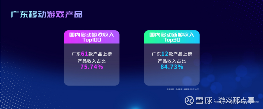 根据点数据提供的数据,截止到11月份,在国内移动游戏的ios端的收入TOP100的榜单中,广东有61款产品上榜,收入占比高达了75.74%。国内移动新游戏TOP30 的榜单中,广东有12款产品上榜,但是我们的收入占比达到了84.73%,占比非常高。其中《燕云十六声》《英雄没有闪》等新品都表现得非常出色。