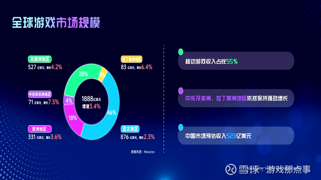 1.据数据,2025年全球游戏市场规模达到了约1888亿美元(折合约13269.05亿元人民币),增长速度达到3.4%。而移动游戏占据的份额达到55%,约1038.4为亿美元(折合约7,297.98亿元人民币),值得注意的是中东及非洲增速到达7.5%,其次是拉丁美洲6.4%,其二将会成为未来全球市场规模的主要增长点。