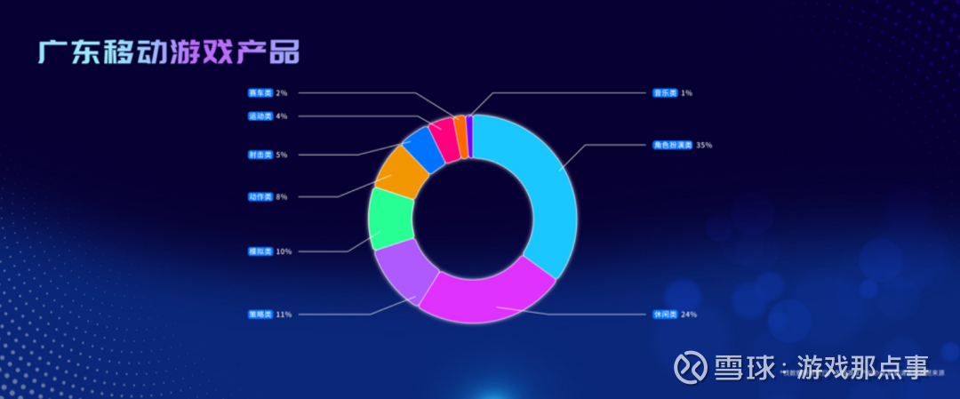 从广东移动游戏产品的品类分布来看,角色扮演类以35%的占比稳居第一,是广东移动游戏的核心优势品类,体现出本地企业在剧情叙事、角色塑造等长线内容运营上的深厚积累;休闲类以24%的占比紧随其后,契合当前轻量化娱乐的用户需求;策略类(11%)、模拟类(10%)、动作类(8%)等品类也形成多元布局,而赛车类(2%)、音乐类(1%)等细分品类占比较低,整体呈现 “头部品类主导、多元赛道补充” 的结构特征,既巩固了主流市场优势,也覆盖了不同用户的娱乐偏好。