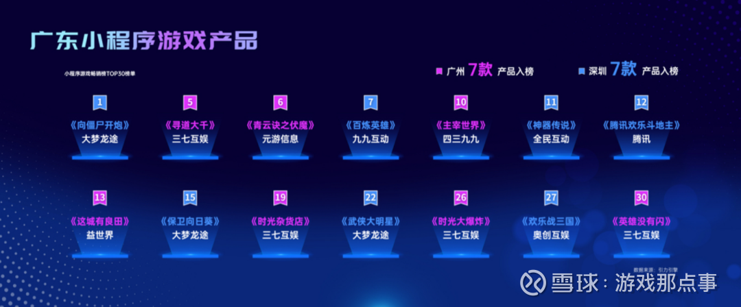 在小游戏畅销TOP30的榜单中有14款的产品来自广东,广深各占了7款,《寻道大千》、《向僵尸开炮》等产品都是名列前茅。