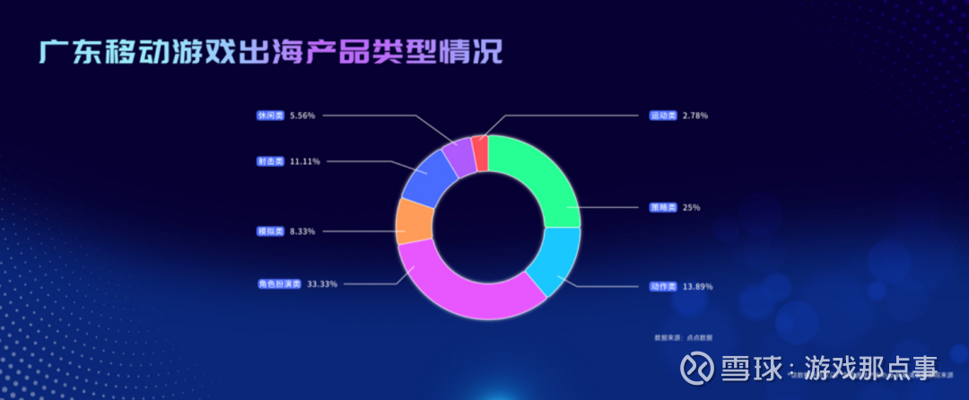从产品类型来看,广东移动游戏出海呈现 “品类集中、优势突出” 的特征。角色扮演类占比最高,达33.33%,是海外市场最受欢迎的品类,印证了广东企业在剧情叙事、角色塑造与长线运营上的深厚积累;动作类占比13.89%,凭借高品质的战斗体验与技术表现力,成为第二大出海品类;休闲类占比仅5%左右,与国内休闲类小游戏的高增长形成反差,反映出广东出海产品更侧重以硬核内容突破海外市场。