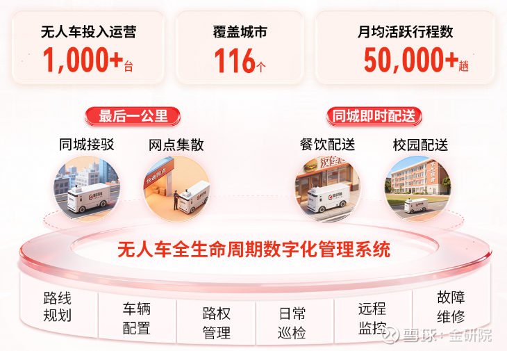 如果说AI优化的是“大脑”,无人配送则是重构末端履约的“新四肢”。截至2025年末,顺丰同城的无人车网络已覆盖全国116个城市,运营车辆规模超1000台,月均活跃行程超5万趟。这意味着,当你漫步在城市街头,偶遇一台穿梭的无人配送车,其背后已是一个覆盖全国的、体系化的智能网络。