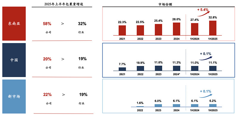 规模/份额:H1总件量139.9亿,东南亚件量32.3亿,市占32.8%,同比提升5.4pct;中国市占11.1%。