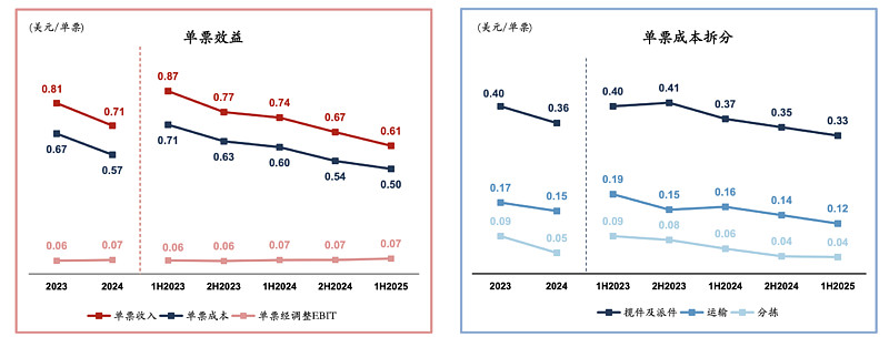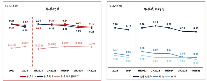 反映在极兔的单票结构里看,分拣和运输的成本曲线持续下移,单票经调EBIT保持稳定,规模效应+设备/系统输出带来边际效率提升。