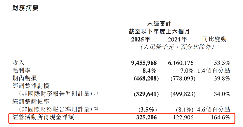2025年上半年,曹操出行营收94.56亿元,同比+53.5%;总订单量3.8亿单,同比+49%。毛利率从去年同期7%提升到8.4%,经营现金流同比暴增160%+。亏损还在,但归母净亏损收窄到4.95亿元,同比少亏三分之一。