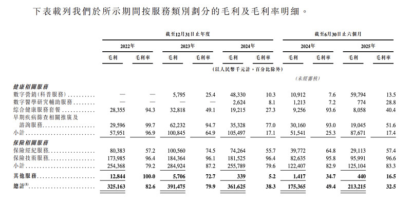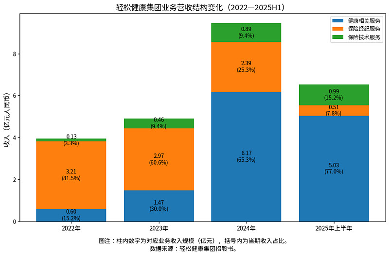 轻松健康也是朝着这条路再走,增长引擎已经发生了明确换挡。从早期公司主要依赖保险经纪收入,过去三年,健康服务与技术服务逐步成为核心增长来源。到2025H1,健康相关服务占比已经来到77%,5亿左右规模。