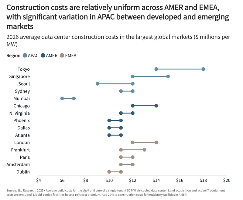灿谷这个CapEx算是啥水平呢,行业基准看,JLL 2026年数据中心报告,全球数据中心建设成本约为1100万美元/MW(仅土建和机电),fit-out(技术设备投入包括GPU等)费用主要是取决于用什么卡,从700万-2000万美元/MW跨度比较大,最高可达到2500万美元/MW。