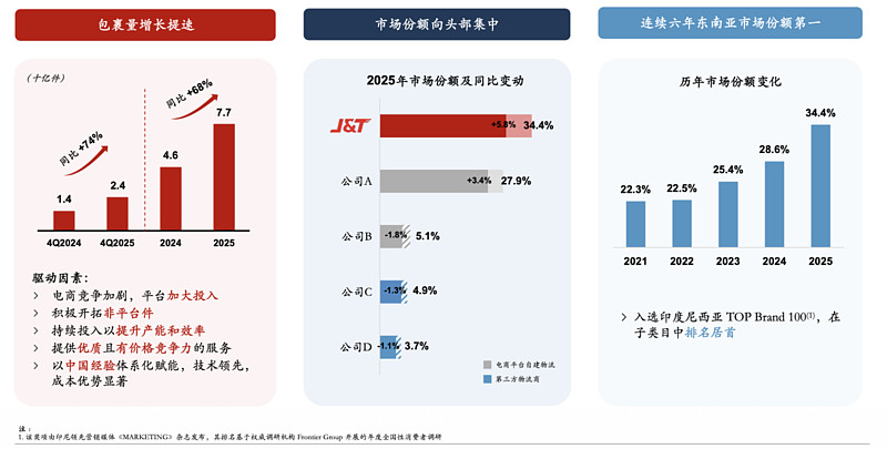 目前公司东南亚业务已经开始展现出典型的正反馈飞轮:件量增长,带动自动化和干线效率提升;成本下降,公司再把一部分效率红利通过价格让给客户,继续换取更多订单,再把网络密度做高。公司披露2025年东南亚新增13套自动化设备、1400辆自有车辆。