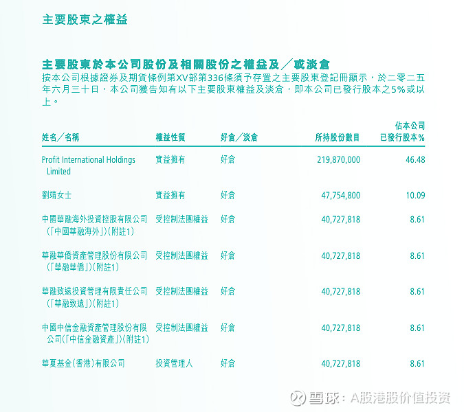 这4072.78万股股份实际上由中国华融海外投资控股有限公司实益拥有。通过一系列的全资或控股关系,这笔股权可以最终追溯至中国中信集团有限公司和中华人民共和国财政部。因此,在权益披露中,这些实体被视为共同拥有这批股份的权益。这表明公司拥有具备强大国资背景的长期机构投资者。