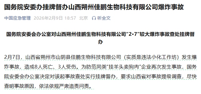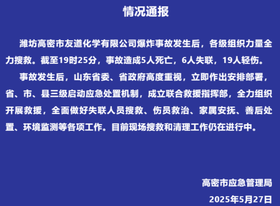 2025年5月27日,山东高密市友道化学有限公司爆炸事故造成5人死亡6人失联19人轻伤。