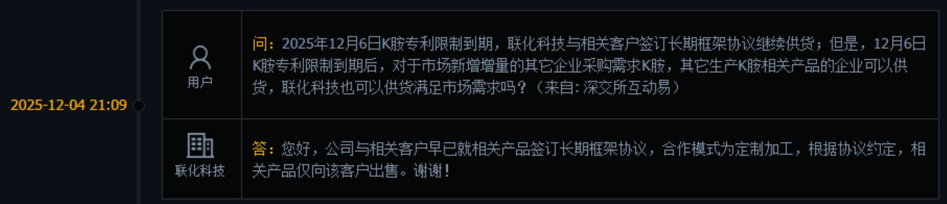 (1)联化科技:CDMO模式,长期协议供货,仅向富美实出售K胺,不对外公开销售。