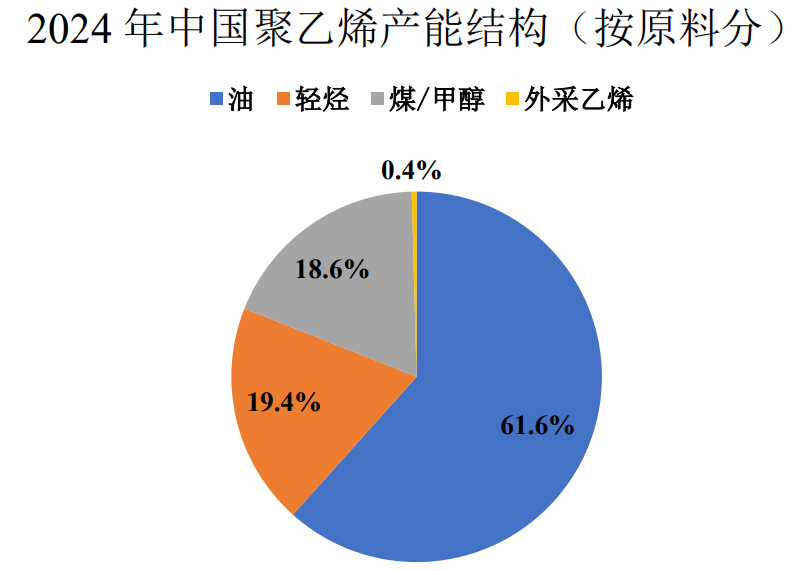 聚乙烯中,油制产能占比 62%,轻烃制占比 19%,煤或甲醇制占比 19%;