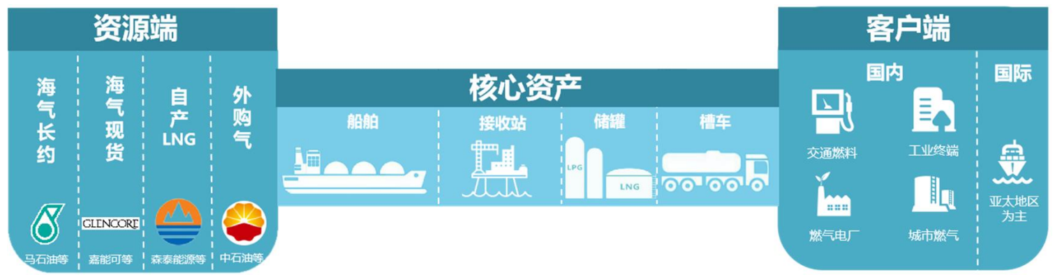 主要包括长约采购和现货采购。长约采购方面,公司与马石油已签订 LNG 长期采购合同,约定年度基础提货量、计量方式、价格计算公式、结算方式等,LNG 气源为马来西亚本土气,能有效实现与终端市场的匹配,并最大程度保证公司资源供应的稳定性及资源价格的可预测性。现货采购方面,公司与国际市场诸多知名能源供应商达成合作协议,根据国内外气价变动情况及需求缺口,灵活进行 LNG 与 LPG 的国际现货采购。