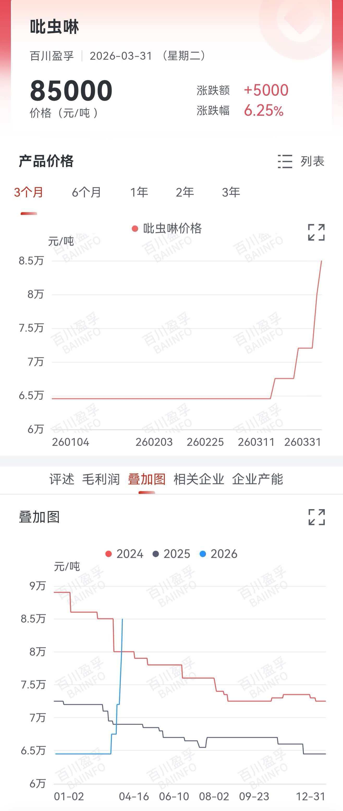 3、产品吡虫啉的价格近期暴涨,从6.5万涨至8.5万,涨幅约30%。