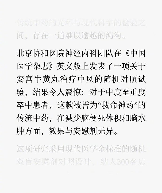 研究表明,安宫牛黄丸效果与安慰剂无异。欢迎反驳。