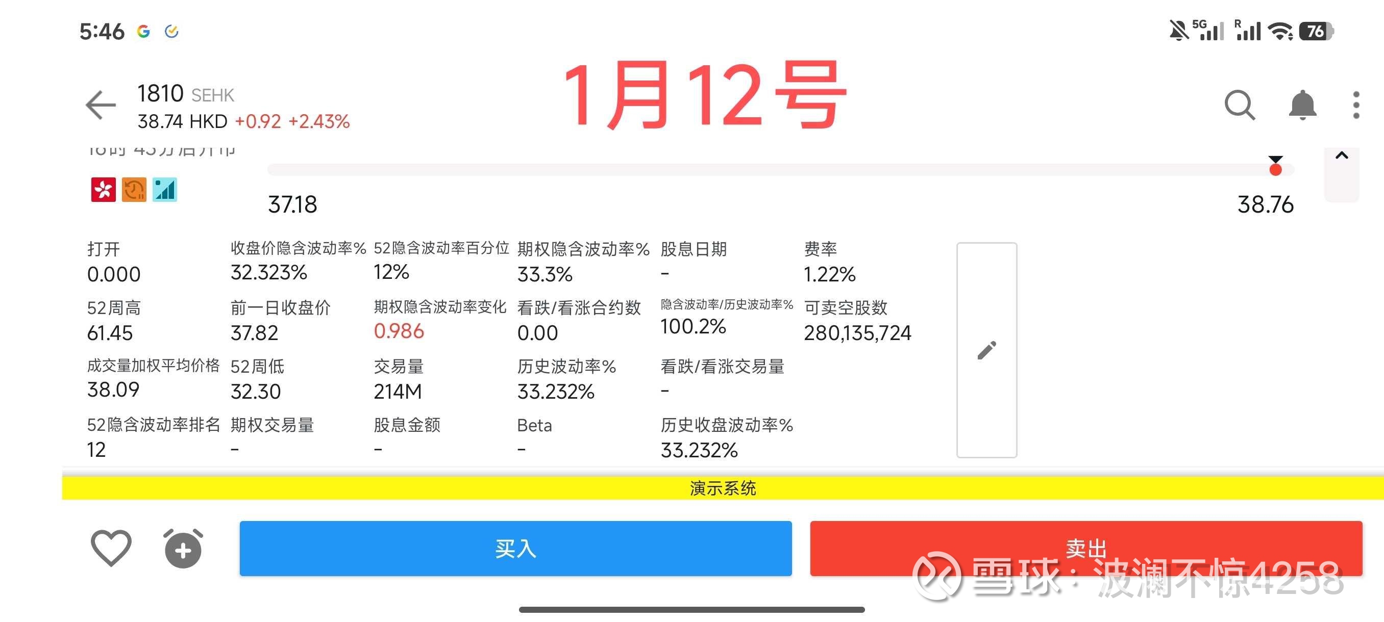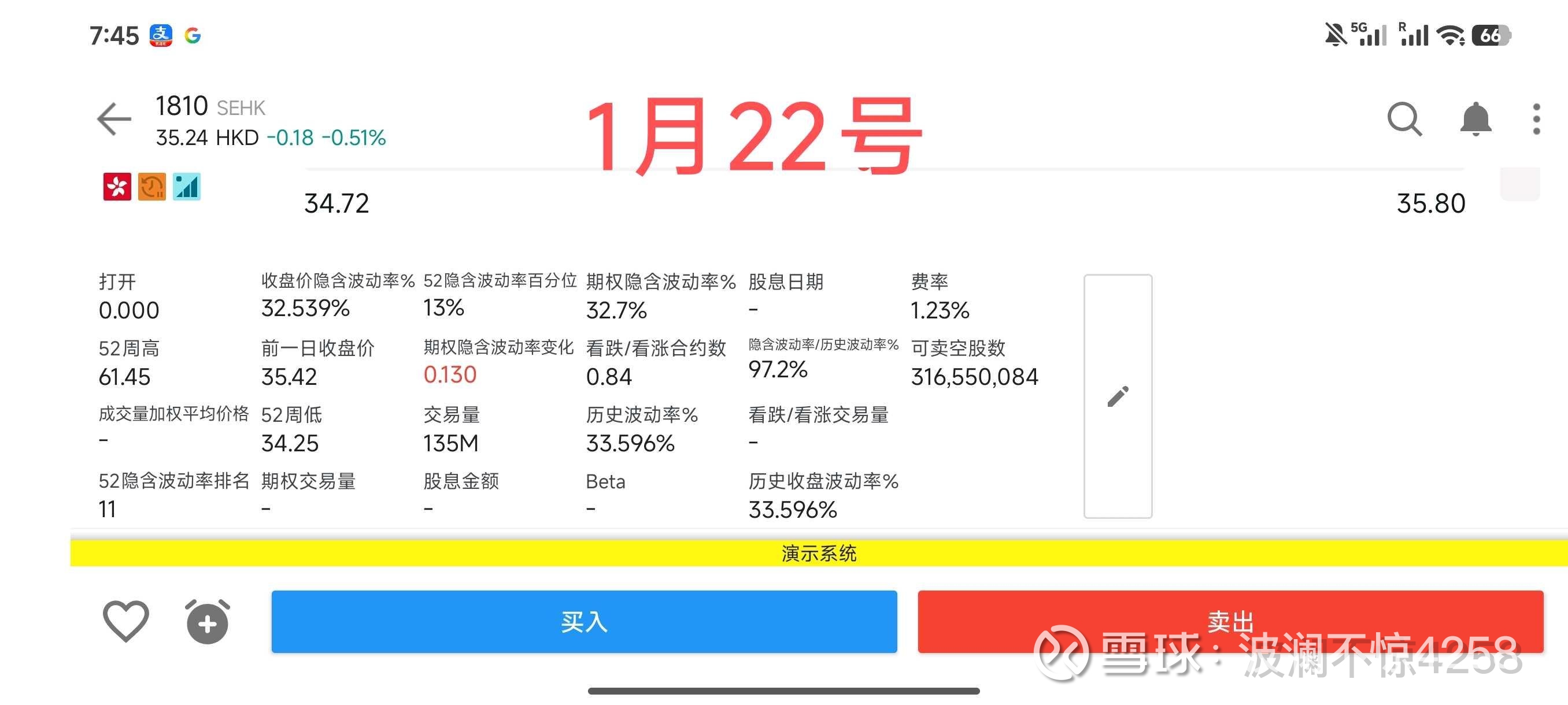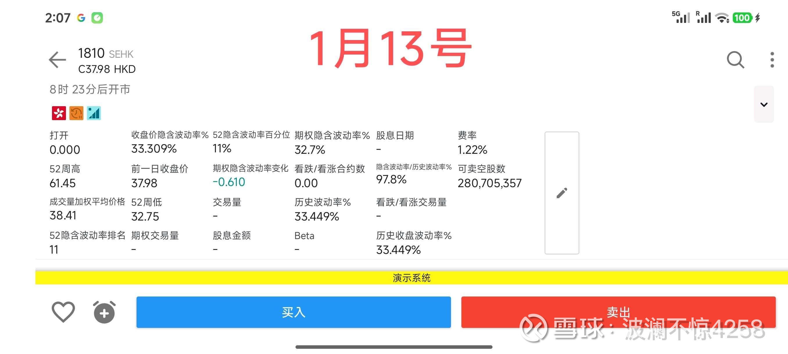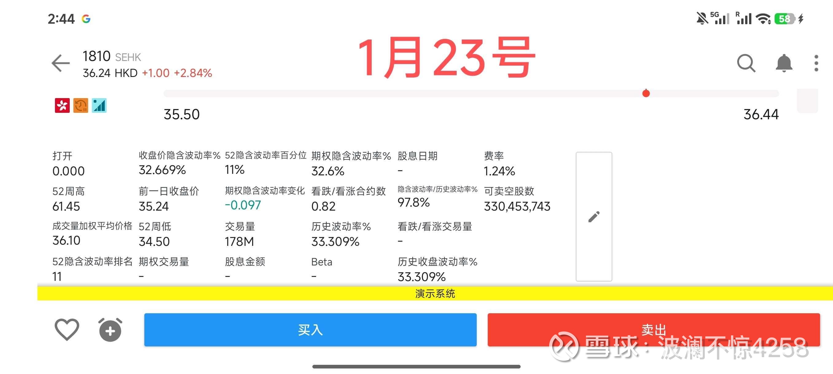 (2)费率提高。1月12号,费率为1.22%;1月22号,费率为1.23%;1月23号,费率为1.24%。变化几乎没有,说明做空小米的融券成本(做空小米的成本)依然很低。(该费率仅代表盈透证券一家,不代表全部做空小米的费率,在网友那边我看过富途做空小米的融券费率是0.95%)