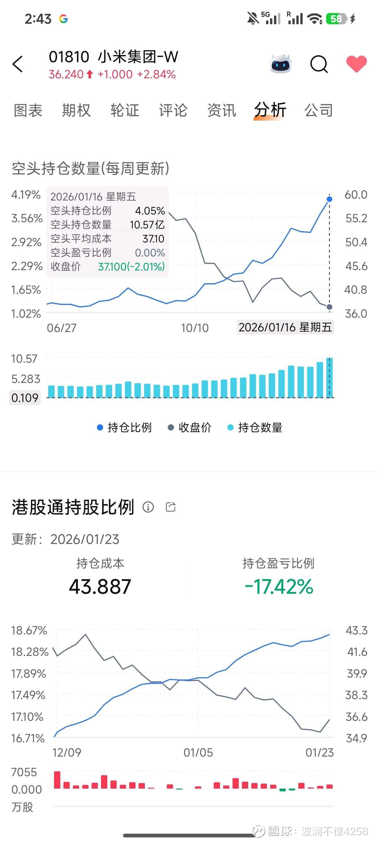 (3)截止到1月16号,空头持仓比例从1月9号的3.64%上升到了4.05%;持仓数量从1月9号的9.48亿股上升到了10.57亿股。平均成本从37.82港元提高到37.1港元(对空头来说价格下跌是成本增加),表明至少到上周五,空头没有任何退缩的意思,还在进一步进攻。