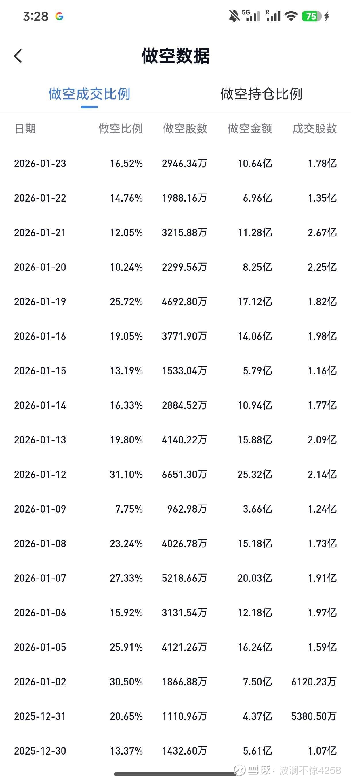 (4)做空力量呈下降趋势。1月12号之后做空比例除了1月19号都在20%以下。