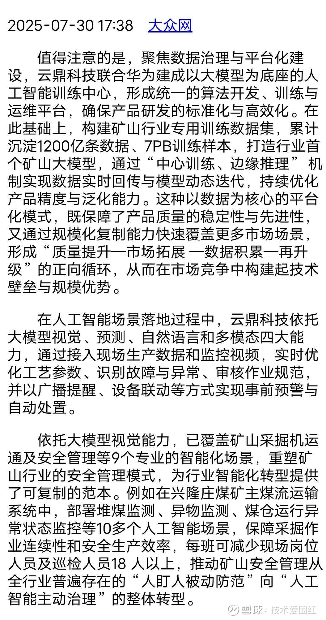 - 华为/昇腾(联合推出工业视觉智能一体机、矿山大模型,共建AI训练中心,提供算力与算法支持)