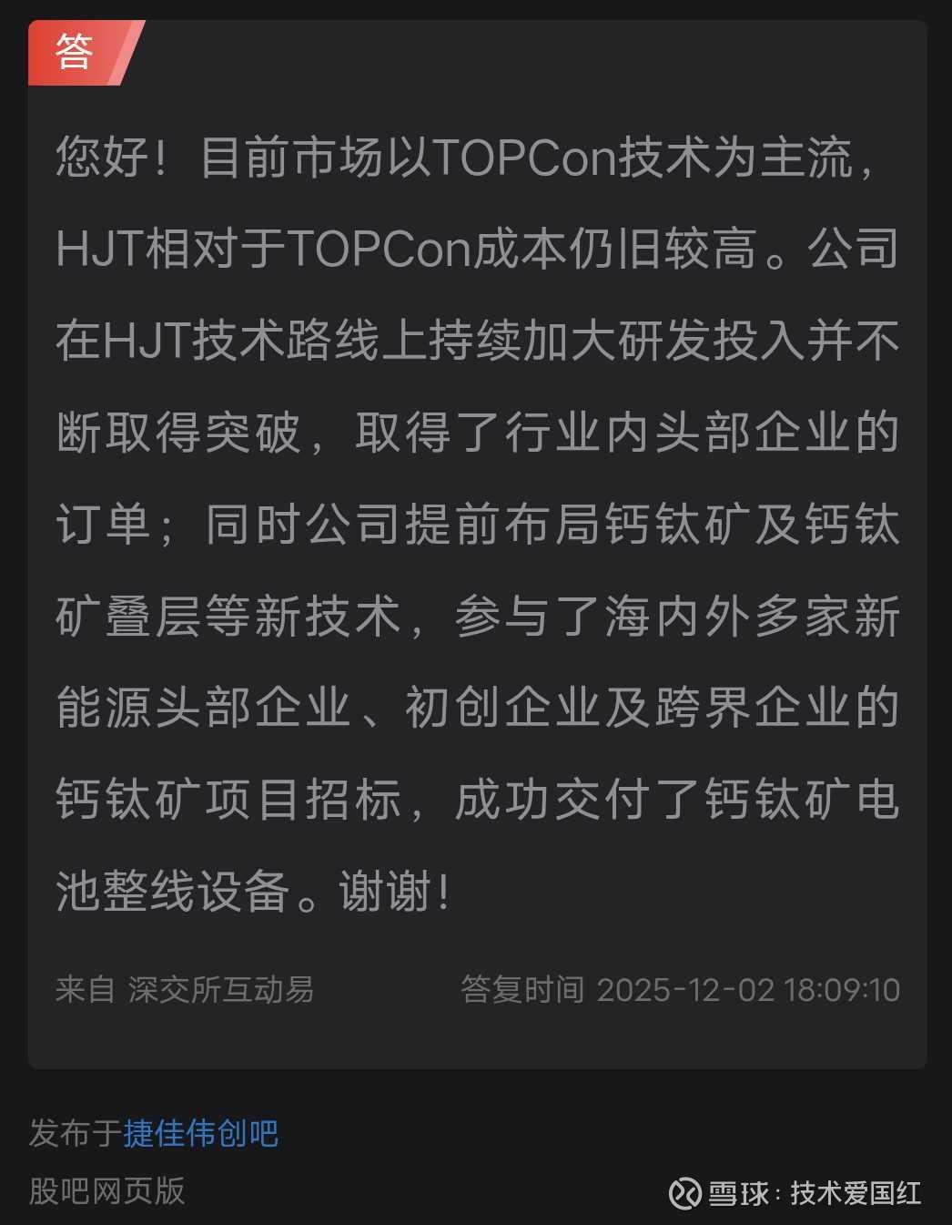6您好!目前市场以TOPCon技术为主流,HJT相对于TOPCon成本仍旧较高。公司在HJT技术路线上持续加大研发投入并不断取得突破,取得了行业内头部企业的订单;同时公司提前布局钙钛矿及钙钛矿叠层等新技术,参与了海内外多家新能源头部企业、初创企业及跨界企业的钙钛矿项目招标,成功交付了钙钛矿电池整线设备。谢谢!