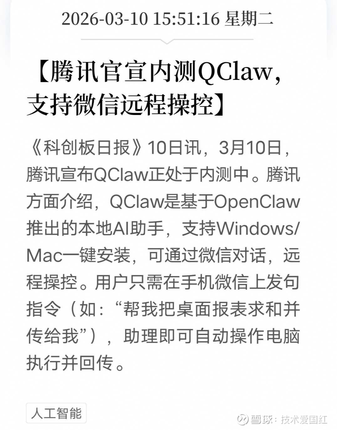 3月10日财联社/科创板日报消息:腾讯官宣QClaw内测。