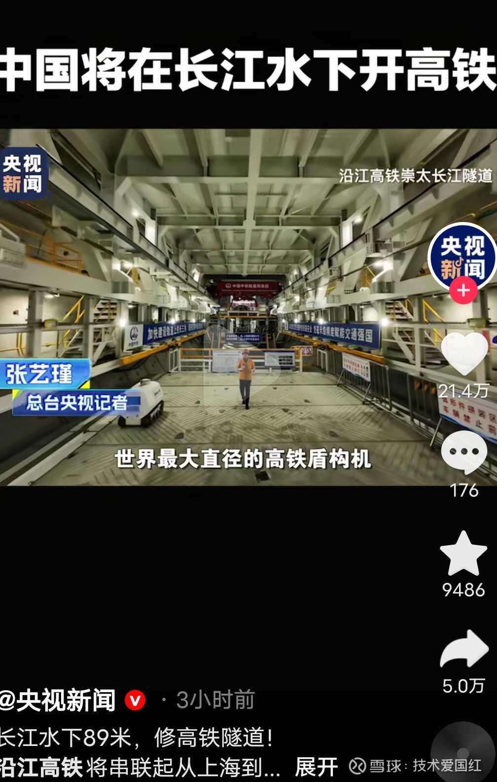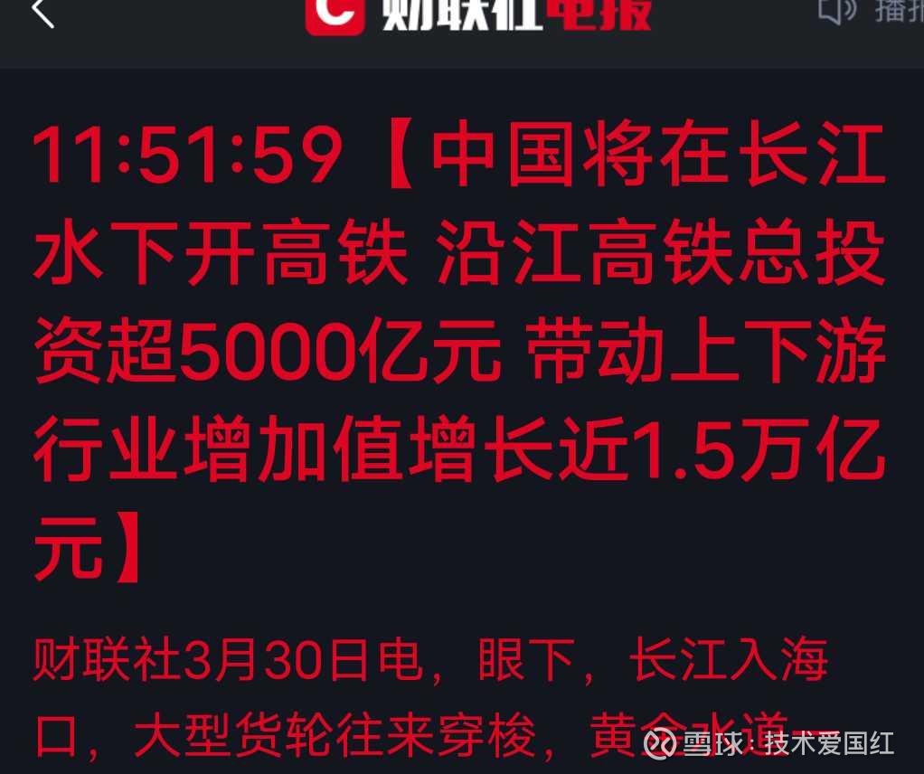 央视新闻与财联社3月30日重磅官宣:沿江高铁总投资超5000亿元,其标志性工程——崇太长江隧道正在长江水下89米处加速掘进,使用的正是世界最大直径高铁盾构机。