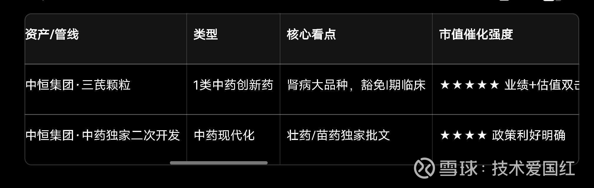- 注入中恒集团三芪颗粒等中药创新药(审批快、协同强、风险低),快速提升公司业绩与估值。