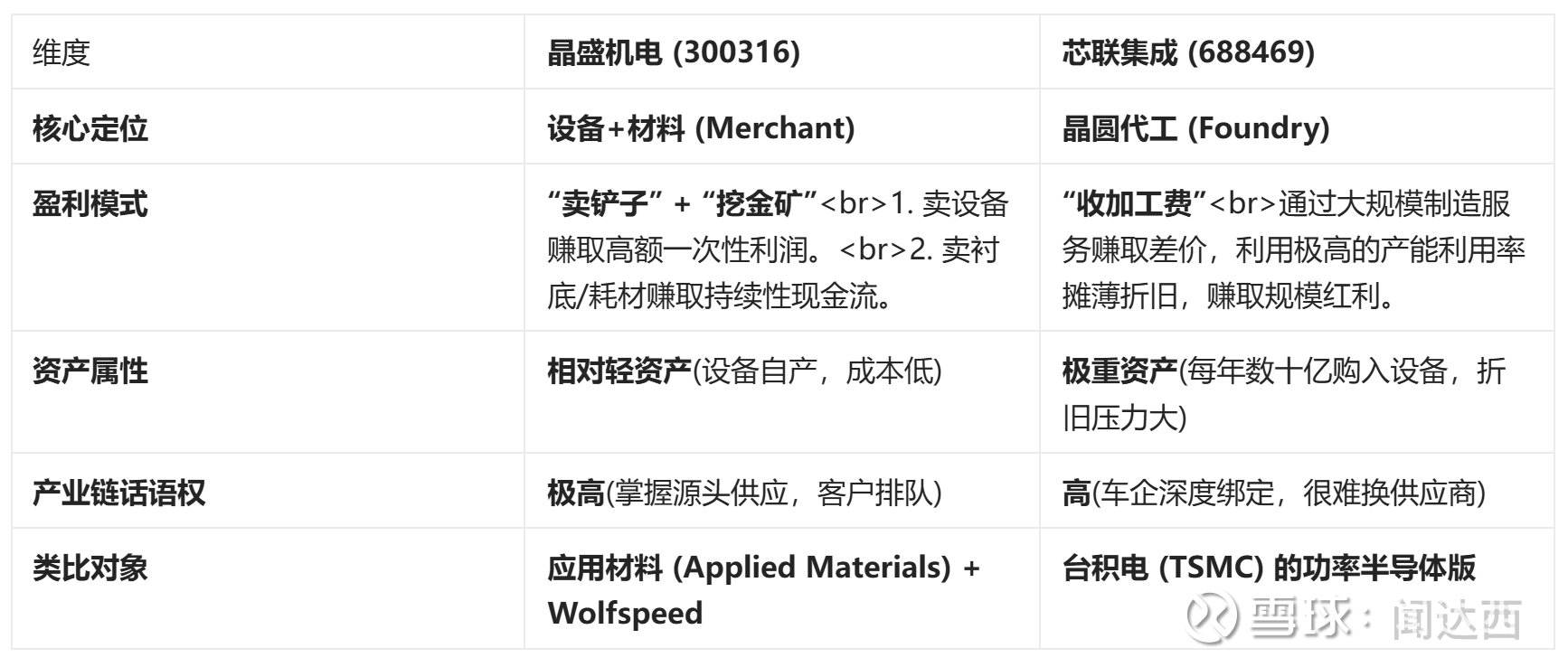 技术上:晶盛在做 0到1的事(很难),芯联在做 1到N且保证N不走样的事(也很难,且极繁琐)。
