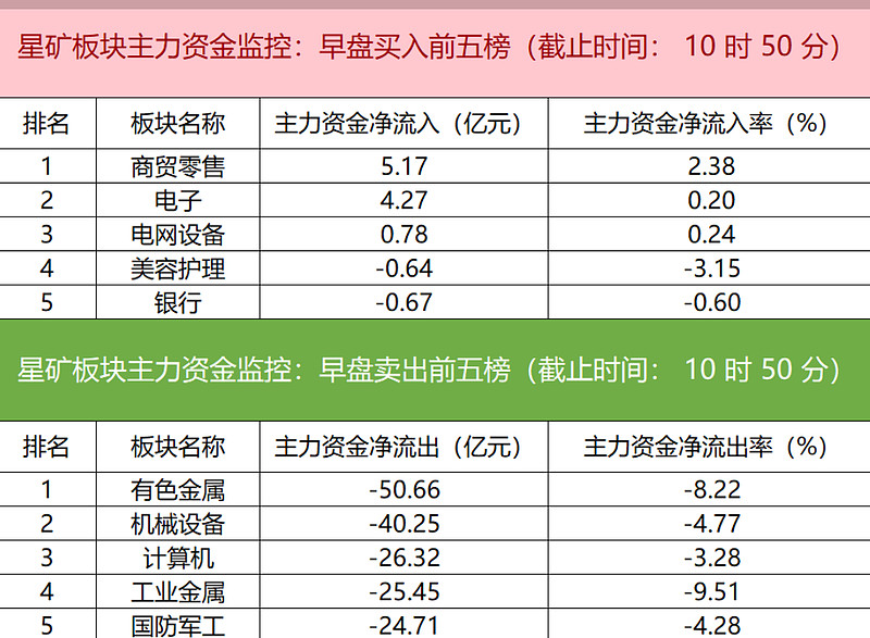 12月9日,财联社星矿数据显示,今日早盘主力资金净流入商贸零售、电子、电网设备等板块,净流出有色金属、机械设备、计算机等板块,其中有色金属板块净流出超50亿元。