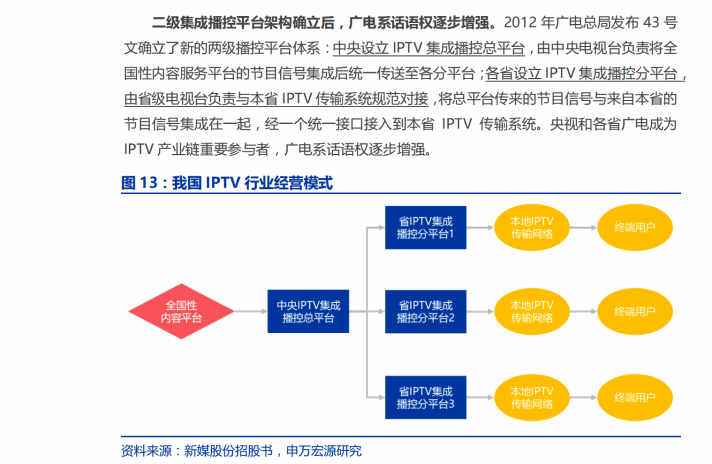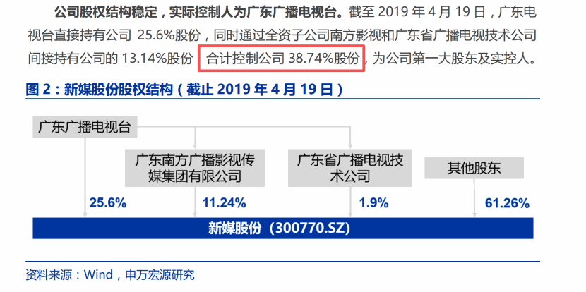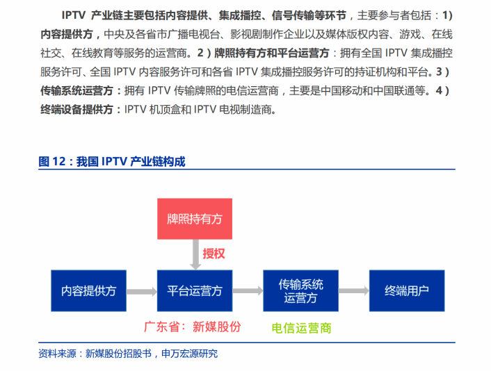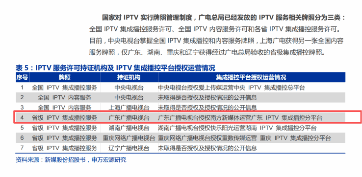 新媒股份是广东广播电视台的子公司,合计控股38.7%,经广东广播电视台授权,公司独家运营广东 IPTV 集成播控服务、互联网电视集成服务和内容服务。