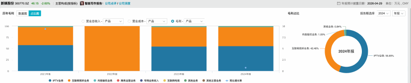 他的业务源自于其拥有两张垄断的牌照,这两张牌照支撑了新媒旗下的两大业务,IPTV和OTT(互联网电视业务),占比各接近50%。