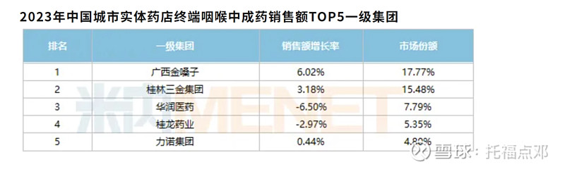 2023年:米内网的数据,非常笼统,只按了中成药厂家做了市占率排序,金嗓子排名第一。