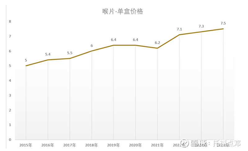 中国咽喉含片OTC的市场规模,2024年大约在70亿左右,过去10年的CAGR 6%, 结合我们之后的分析,增长主要来自于提价,因此是一个典型的成熟利基市场。