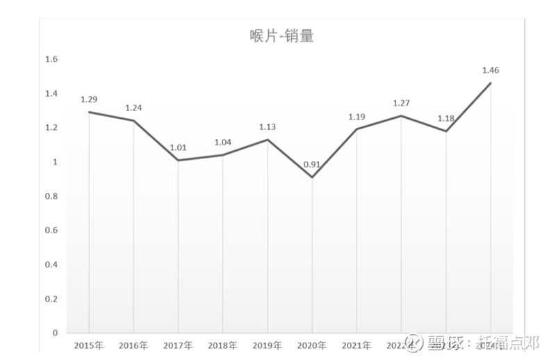 2024年金嗓子喉片(OTC)销量为1.4556亿盒,较2023年的1.1813亿盒增长了2743万盒。