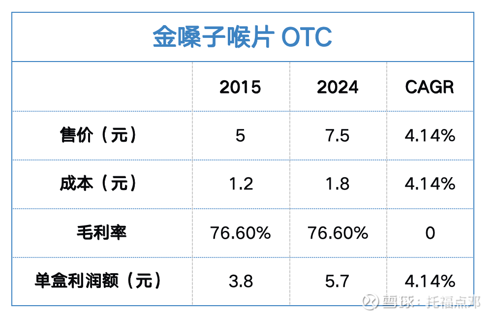 金嗓子喉片过去10年始终坚持以覆盖成本涨幅为前提,保持毛利率不变的提价逻辑。