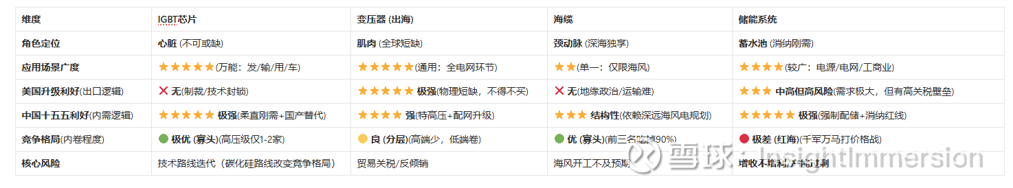 在正式拆解变压器之前,为了让大家对整个电力赛道有一个更立体、更直观的认知,我将IGBT、变压器、海缆、储能这四大核心赛道放在一张图里,进行横向维度的终极PK。