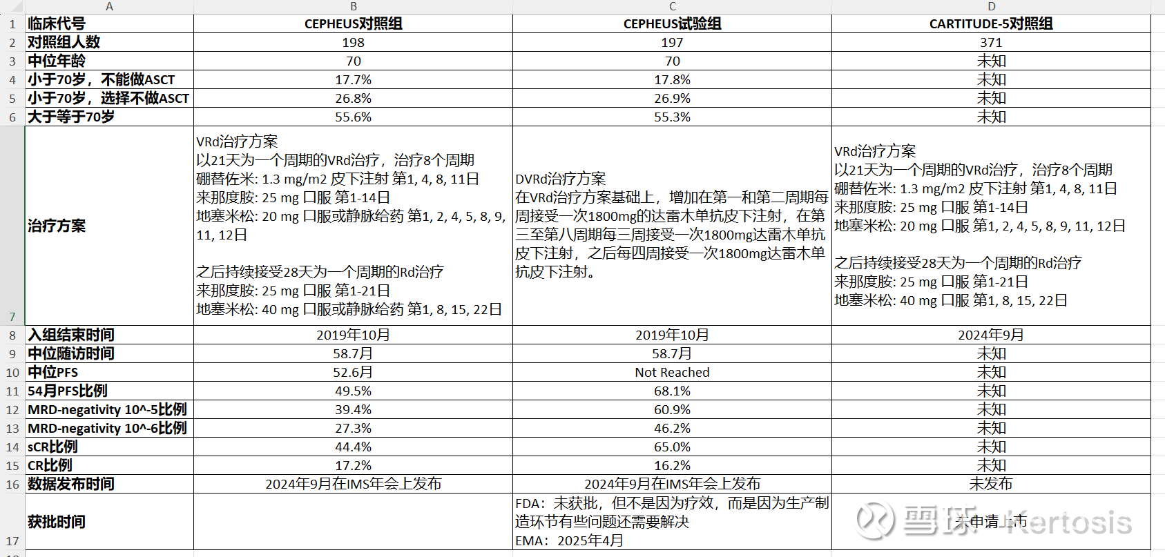 最后这几张截图是总结表和CEPHEUS临床中试验组和对照组的数据。对照组的数据我看了一下,PFS也就比CARTITUDE-4的Carvykti试验组好一点(以30月PFS为例,CEPHEUS对照组大约是70%,CARTITUDE-4的试验组是59.4%)。但CARTITUDE-4的试验组平均接受过1.94线治疗,身体条件比新诊断MM患者差很多,所以CARTITUDE-5试验组打败对照组是毫无悬念的,但是现在SOC已经不是VRd了,而是DVRd,Carvykti能否打败在这个群体中是否能击败DVRd,让我们拭目以待。