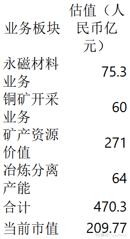 广晟有色正积极向产业链下游延伸,其晟源永磁项目旨在建设年产8000吨的高性能钕铁硼永磁材料生产基地 。该项目已于2023年1月投料试产 ,预计达产后年均净利润可达人民币2.51亿元 。考虑到永磁材料行业的高成长性和高技术壁垒 ,本报告采用30倍市盈率进行估值,得出该业务板块价值为人民币75.3亿元。