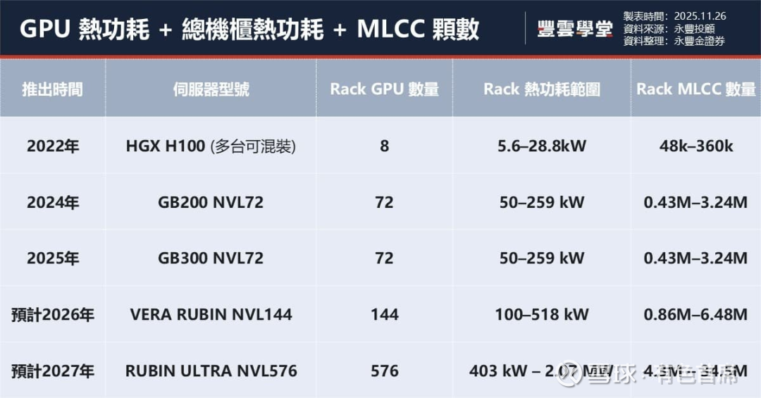 数据显示,NVL36与NVL72分别需要约 23.4 万颗和 44.1万颗高阶 MLCC,是一般AI 服务器用量的10–21倍,带动 MLCC单机价值提升至2500–4600美元。